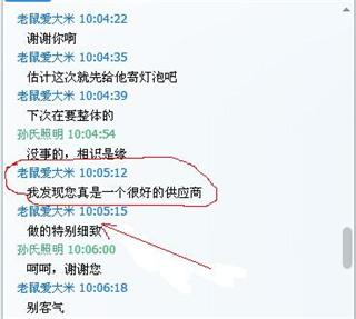 客戶通過蘇州孫氏照明的官網然后看了我們的阿里巴巴找到了我們,在聊天當中,我以誠相待,用心的回答客戶的每一個疑問,在聊天過程中,客戶主動給了我他的聯系方式和QQ,接著我加了客戶的QQ(我的QQ是493501422)。說明客戶對我的信任,相信孫氏照明的實力。