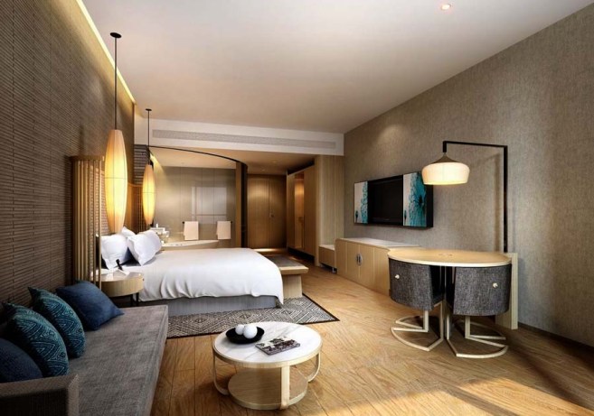 酒店客房一般要追求靜謐、溫馨,甚至懶散的感覺,因此整體照度我們建議控制在50-100Lux;但是像床頭燈、書桌臺燈、化妝鏡燈這類功能要求比較強的燈,則建議選用300Lux的照度值,以滿足房客的對應需求;其中,比較容易最被忽略,就是客房的書桌,甚至很多酒店未提供書寫臺燈,這是非常欠妥的做法。